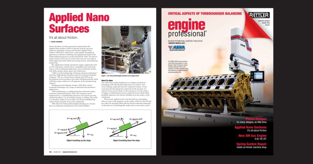 Sunnen Products recently announced a partnership with Applied Nano Surfaces (ANS) to advance friction and wear reduction technology. Sunnen and Sweden’s Applied Nano Surfaces (ANS) have entered into a joint market development agreement to advance technology and applications based on the Triboconditioning process recently patented by ANS. The process reduces friction and wear on various steel and cast iron surfaces while improving surface finish, preventing seizures, and enhancing product life.