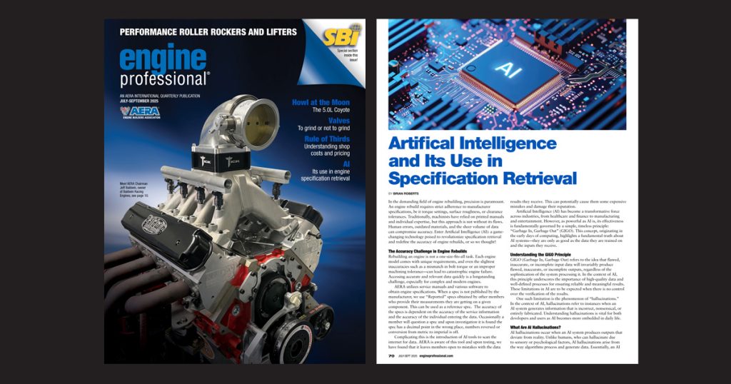 For example: During testing of AI tools to retrieve specifications, I found that many results that were incorrect had the same spec listed repeatedly. This to me is the AI hallucination effect. The AI tool could not find the result to the answer for the spec and basically used a published spec from another engine. This incorrect spec had no link to a source for the spec as one did not exist. This is a risk for machine shops, and they need to be aware of and understand AI limitations to avoid pitfalls that could cost them financially and their reputation.