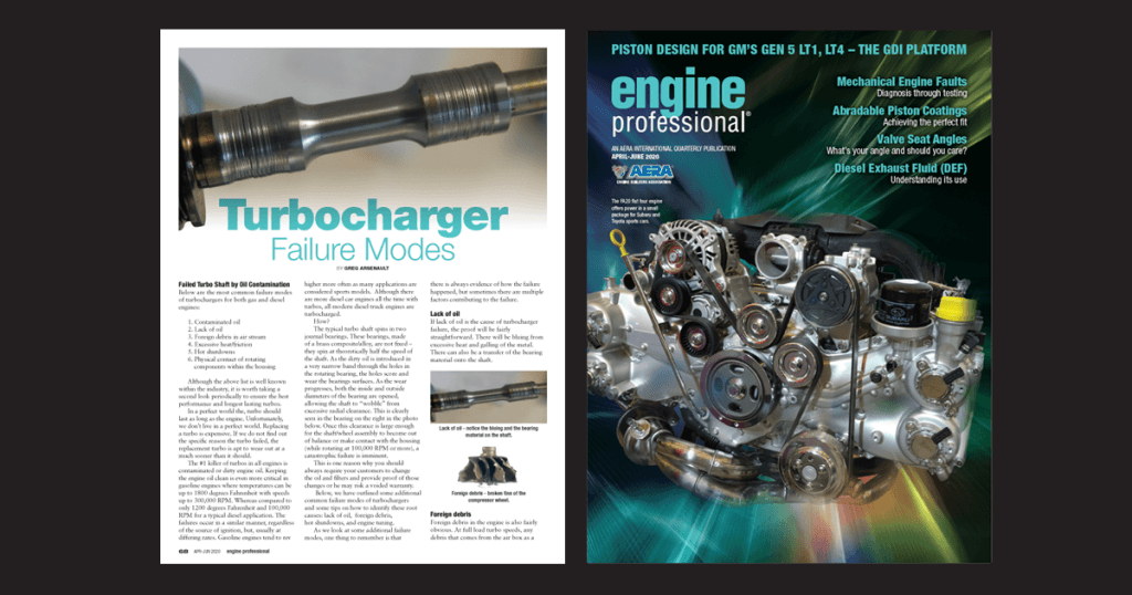 The most common failure modes of turbochargers for both gas and diesel engines are: 1) Contaminated oil, 2) Lack of oil, 3) Foreign debris in air stream, 4) Excessive heat/friction, 5) Hot shutdowns, 6) Physical contact of rotating components within the housing.